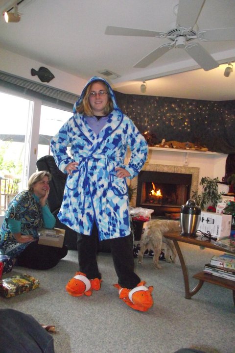 Last December, Mom brought the lime-green plastic crocodile lights in from the hot tub patio and added them to the tree.  This year, it’s decorated completely with birds and tropical fish, though the old Christmas tree skirt emblazoned with Santa’s elves riding trains has remained.