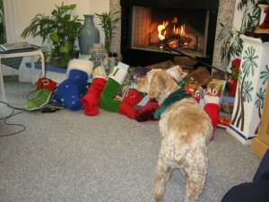 As you can see, Cuda, the cockapoo who replaced my brother and me in my parents’ home when we grew up, gets his own stocking. He knows which one is his, as I will prove to you in a few moments. But he knows as well as any child who deserves a visit from Santa that he can’t open it until we say he can.
