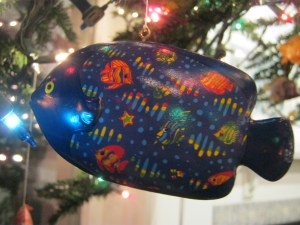 A few years ago, I made her a new extra-large stocking out of royal blue fabric with fish figurines sewn on it. Among the odder elements of my family’s Christmas, the most prominent decorations are tropical creatures.