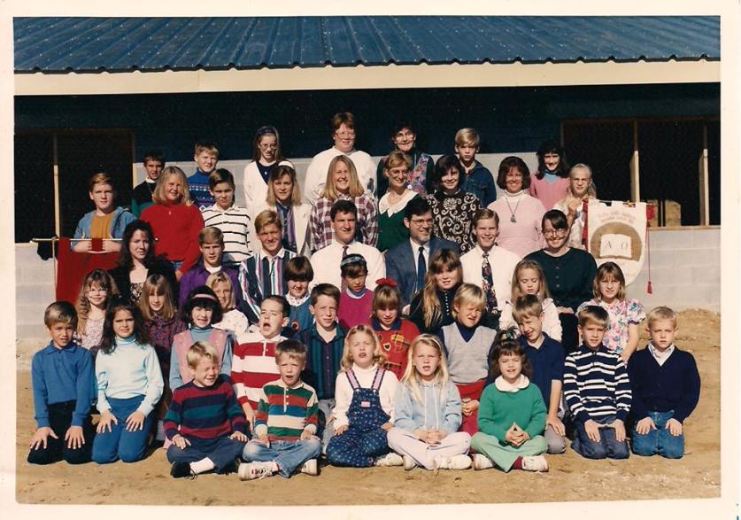 As you can see, we were an extremely small school. And Saturday was the only blessed day of the week most of us didn’t have to go to a chapel or church service. Each year, we posed for a picture of all the faculty and students, and 1993 was a particularly exciting year: we were about to move into a newly constructed wing of the school building. I’m sure that’s the reason someone decided dirt and cinderblocks would make a lovely backdrop for our group portrait.