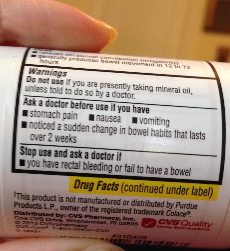 It seems strange to me, in retrospect, that constipation, while a nearly universal experience, is so little discussed. Even my surgeons, in the pre-op appointments, made the merest reference to it as a common side-effect of the narcotic I’d be on, airily recommending the addition of a stool softener to my at-home pharmacy.