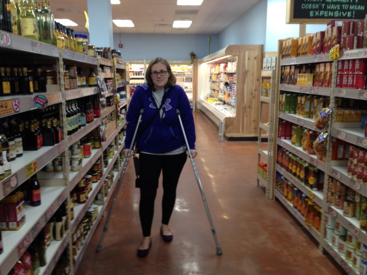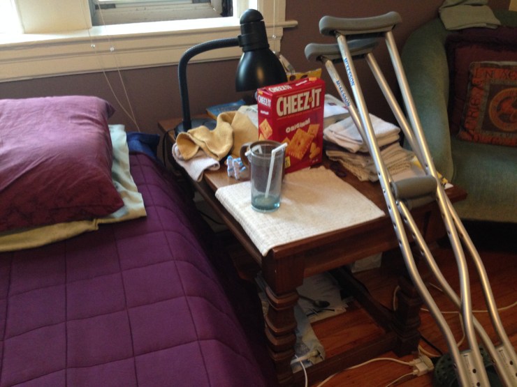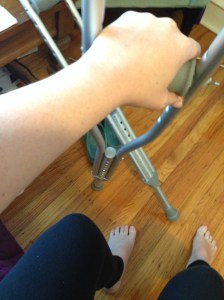 I don’t want to be too sanguine about crutches. Remember when your friend in elementary school broke his ankle and everyone was begging to try out his crutches? Yeah, well it’s not so fun now. My neck and shoulders are in knots, the heels of my hands are sore, and if I so much as look at a single stair in a public place, people stop to ask if I’m OK.  It’s amazing how long you can put off going pee when you have to go to the bathroom on crutches.
