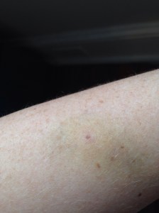 So my date and I picked up some beer and a pizza we had already ordered. I poured disinfectant over the bite when I got home and then wrapped my arm in an ice pack while I ate two slices of pizza one-handed. My arm throbbed and swelled and the purple deepened around the teeth marks. It was too painful to use. The bite was worse than I’d thought when it happened.
